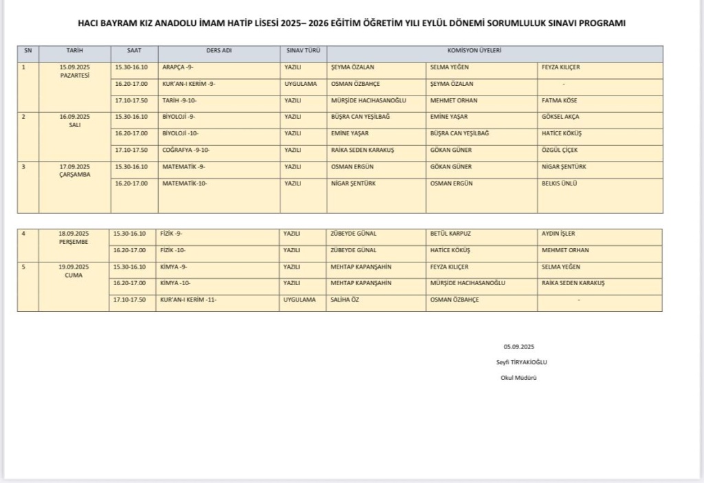 EYLÜL AYI SORUMLULUK SINAVLARI TAKVİMİ